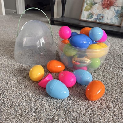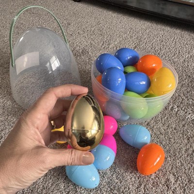 [This review was collected as part of a promotion.] We always have an annual Easter egg hunt every year so I purchased these because I liked that they came in the big plastic container. I will be using the big plastic container to give away a prize for finding one of the golden eggs. The eggs themselves are great quality and they are sturdy, which I needed them to be, since they will get run over and the cheaper ones always get crushed. Great purchase! I received an incentive to write this review.