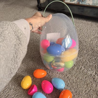 [This review was collected as part of a promotion.] This is the cutest large egg set. I decided I was going to use these this year instead of having individual baskets. You can put multiple things inside it along with some Easter grass and seal it shut. It even has a handle like a basket would. Inside our extra large eggs and even a gold egg too. Each egg comes in two separate pieces there is not a tab to keep them together and they snapped together very well. I received an incentive to write this review.