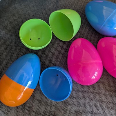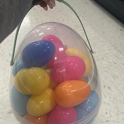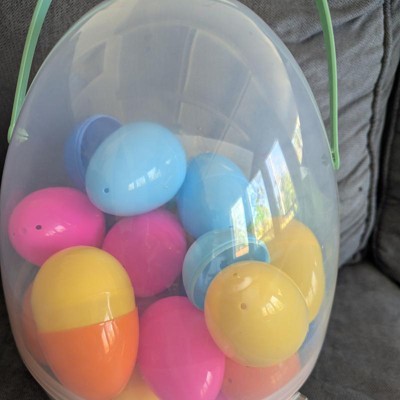 [This review was collected as part of a promotion.] I purchased this plastic egg set to replace a bunch of mismatched smaller plastic eggs I use for my kids Easter hunt. I like that this container has a handle on it and it's shaped like an egg so it's festive for Easter. I also like that the eggs are on the larger side because because it has room to stuff them with candy as well as money or gift cards for the big kid egg hunt. This set also comes with one golden egg which is always nice to have for the bigger prize. The eggs are easy to open and close. I received an incentive to write this review.