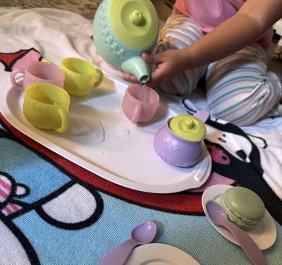 This Plastic Tea Set from Gigglescape™ is a fun way to keep your child happily entertained with pretend tea parties. Made from plastic, this set comes with 21 total pieces, including a smiley-face teapot, teacups, plates, a tray, sugar container, play macarons and more. Great for helping develop their fine motor skills, this plastic tea set also promotes imaginative play, and it's recommended for ages two and up.