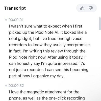 [This review was collected as part of a promotion.] Overall this little device is pretty neat! Setup was a whiz and I scanned a QR code that came in the packaging and had everything set up in a matter of seconds. I was surprised by how tiny and thin this little thing is, so that was a plus! I am hard of hearing and struggle in loud environments and thought this might be useful to record doctors appts and meetings and to have a summary I can refer back to, especially when i worry I missed things due to hearing. I only see two negatives: one it requires a special charger and I’m bound to lose the thing. And two, I wish it transcribed in real time as that would have all the more utility for me. I imagine that for some, like me, this device is a game changer and worth every penny, I tried recording while the tv was blasting in the background and it perfectly transcribed the conversation. Excited to put this to further use! I received an incentive to write this review.