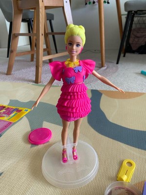 Create super cute styles with the Ruffles and Bows set! It's easy and fun to make Play-Doh Barbie doll clothing with this arts and crafts kit. Just place the doll on the stand, use the Play-Doh Pattern sheet and cutters to cut Barbie dresses, and dress her up in the most creative ways imaginable. Give her different Play-Doh hairstyles with the hair mold or kids can make their own by hand. Add Barbie doll accessories like a purse and shoes to complete her look. Keep the imaginative play going with 2 cans of Play-Doh modeling compound to add even more details. Give a fabulously fashionable gift for kids who love Barbie playsets and Play-Doh toys!