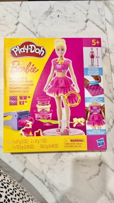 Includes Barbie doll, stand, hair mold, cutter, ruffle maker with 2 attachments, pair of shoes, necklace, knife, roller, 1 Play-Doh Pattern sheet, and 3 cans of Play-Doh Brand Modeling Compound (total 6.41 oz/182.3 g)