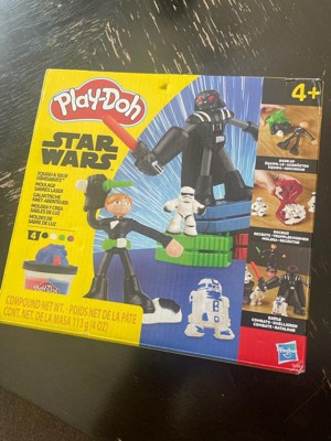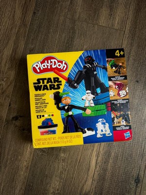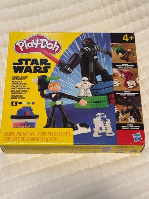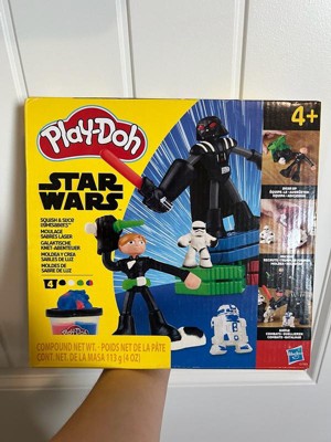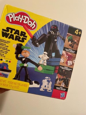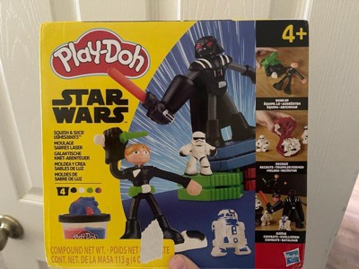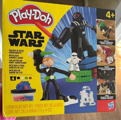 The Force of creativity is strong with the Play-Doh Star Wars Squish & Slice Lightsabers toy set! Recreate the iconic battle between Luke Skywalker and Darth Vader with bendy sensory play figures and Play-Doh tools. Make a Play-Doh cape for the Darth Vader action figure and equip him with his detachable red Lightsaber accessory. Meanwhile, prepare Luke for battle with a Play-Doh Lightsaber, belt, and R2-D2 by his side. 4 mini Play-Doh cans help get their creativity into hyperdrive. Imagination toys like this Play-Doh playset make great Star Wars gifts for boys and girls 3 years and up! Star Wars products are produced by Hasbro under license from Lucasfilm Ltd. PLAY-DOH and HASBRO and all related trademarks and logos are trademarks of Hasbro, Inc. Includes Luke Skywalker figure, Darth Vader figure, Lightsaber accessory, cape cutter, 3 book-mold display stands, and 4 cans of Play-Doh Brand Modeling Compound (net wt. 4 oz/113 g). Ages 4 years and up Not intended to be eaten. Notice to Parents: Contains Wheat. Non-Toxic. Conforms to: ASTM D-4236. Molded results vary depending on child's age and level of skill.