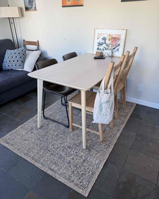 [This review was collected as part of a promotion.] Great quality rug for the price! The material itself is thick and feels sturdy to walk on and doesn't slide. Perfect for going under a table as it keeps the table and chairs steady in place and doesn't move around much. Would highly recommend for any space to run underneath a table or even just a decor piece on its own. The pattern is nice but also subtle enough to not crowd an existing space I received an incentive to write this review.