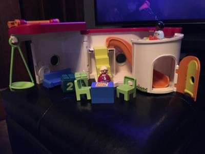 [This review was collected as part of a promotion.] At first impression, I thought this toy was very cute. It's small enough for a young child to carry around room to room or even leaving the house with. It locks and has a carrying handle. It has different accessories it comes with to complete the "preschool". Unfortunately, the carrying handle pops off easily as does one of the doors. It is easily fixable but can get annoying if your child figures out how to get it off. All in all its a cute and functional toy.