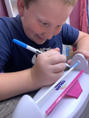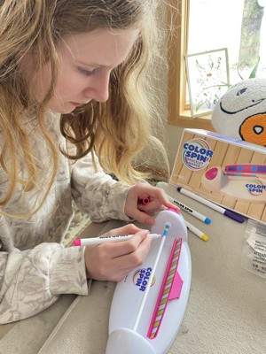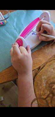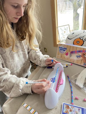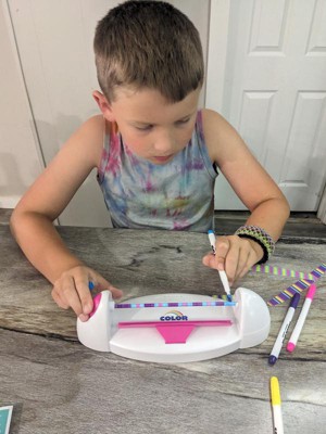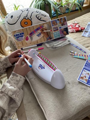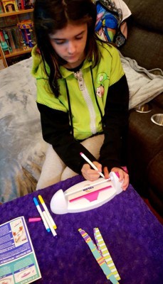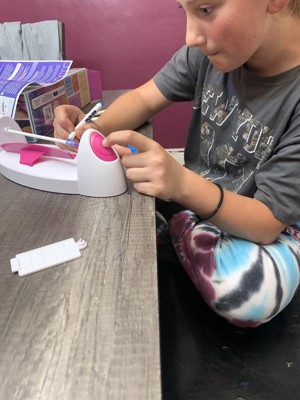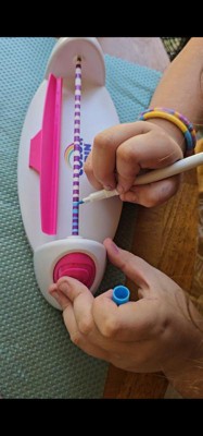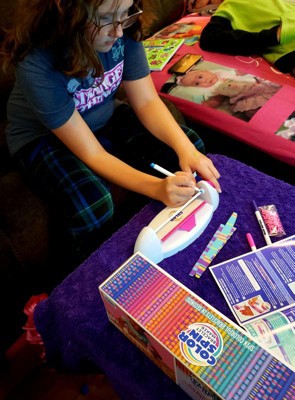 I received this product in exchange for an honest review. My daughter was excited to receive this art project to design and make a new style of friendship bracelets. The Color Spin machine is easy to assemble and use - just make sure you have batteries on hand. My daughter started creating bracelet designs right away. The rubber tubes were a little tricky to remove from the bar after coloring. And even after waiting a long time to make sure the ink was dry, we still had some smudging when pulling the bracelet off the bar. The pink clasps work really well. The project is simple and can be done independently by a 10 year old. Coloring the bracelet is very quick and we will go through the 15 rubber bracelets in no time. My daughter took a few to school today to give friends. I think we need to figure out how to order more blank rubber tubes.