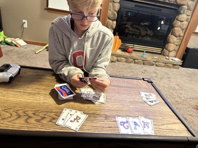 We were gifted this to try out and I'm so glad because this is such a fun family game. The game seems so simple, take some cards and make some words, but once you hit five cards it is much harder then you think!! My older son and husband had a blast with this and really got into who could make the longer word. My 8 year old had some trouble but l loved that this incorporated learning into our family game night. Though it makes you think, it is still fun!! I do recommend keeping a dictionary on hand for this though!! My only suggestion as many other have had, is to remake the size of the letters on the cards. The middle images are hard to decipher on some letters and if anyone is hard of seeing the corner letters are rather small. Other than that though I can see this being a nice rotation for family nights.