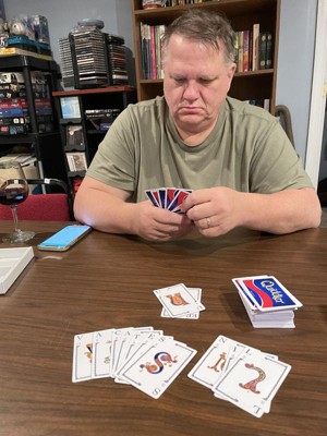 My dad and I play the best of three games each night. It is a great game for mental acuity. The one difficulty is that my dad has less than 20% vision in only one eye. He cannot decipher the artwork in the middle, and the corner letters are still too small for him to see. I would love to see a version of this with the corner letters as large as possible and the points listed in the middle, as a "barebones" vision impaired version.