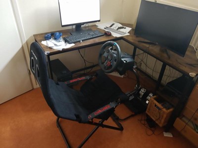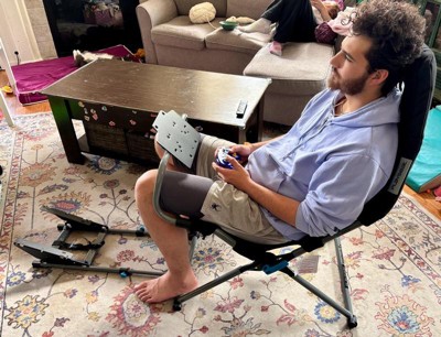 [This review was collected as part of a promotion.] My boyfriend had been wanting one of these seats for a while and was super excited for it! There’s definitely some pros and cons to it though. The initial setup was moderately easy, but requires some ingenuity, as the instructions have no words, but rather only very vague photos. The wheel mount that goes over your lap was very difficult to get attached to the chair and seems improperly fit. Took quite a bit of force to get it popped into place on the one side, but luckily this step is only needed for first time assembly. However the other side, which has a twisting lock/unlock that allows the wheel mount bar to swing up (so you can exit the chair), does not align correctly. This makes it difficult to get in/out of the chair easily, and requires extra force to push the bar into the proper position to swing up. Not sure if we received a faulty chair, or if this is intentional. Other than this, he really liked it! The chair is very heavy but feels quite sturdy. The seat is attached with heavy duty Velcro, so we’ll have to see how it holds up over time. His Logitech steering wheel and pedals attached perfectly. There were plenty of Velcro straps provided to manage the cords as well. It can be folded easily with everything attached, which is great for storage. Note that you’ll likely want a lower screen setup for use with this, since the chair sits lower than your typical desk/gaming chair. Great for a fun racing setup that can be hidden away when not in use!