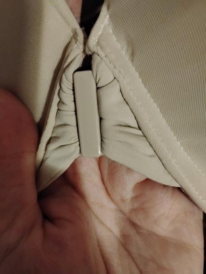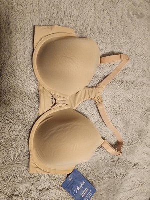 [This review was collected as part of a promotion.] I received this front closure t-back bra from Playtex at no charge. The bra is very nice. The front closure is plastic and very easy to use and stays secure. The back is very smooth and barely shows under clothes. The sides and back are tricot fabric and lay smoothly without showing bulges. The straps are nice and smooth, but there is a little inward slippage that shows up in the neckline of some tops The cups are smooth and supportive. The cups are molded and smooth, no wrinkles or crumples as some molded cups do. It's a great look under knit tops - smooth and no nipple show through. I washed it in my machine using a lingerie bag and it came out as good as new. The only complaint I would have is that it seems to lose some support the longer I wear it, but I have droopy breasts and it's not uncommon for any bras I wear. I would recommend it to anyone who likes molded cups and need the t-back.