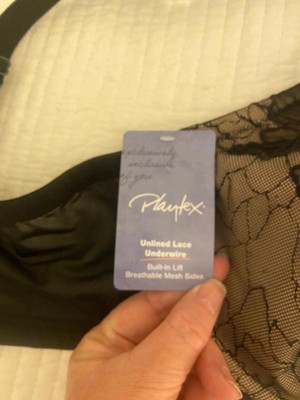 [This review was collected as part of a promotion.] This Playtex bra is beautiful. I got Black lace with nude backing. It has mesh sides. Comfortable to wear the lace is soft, not itchy. The underwire provide great lift. It is unlined. I like that the straps are adjustable and stay put. Several hooks in back to get a good fit. The only thing I didn't like is that the seam up the front of both cups, shows through your clothes.