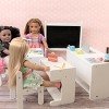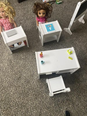 This darling Playtime by Eimmie Classroom set is ideal for any 14 to 18-inch doll and includes all the necessary accessories to conduct a class for any subject you choose. Includes a teacher's desk and two student desks too. Other accessories include a polka dot patterned backpack, microscope, lunch pail, laptop, a free-standing chalkboard, and much more. This set will ensure that your dolls are ready for school and ready to tackle any subject no matter where their curiosity takes them. This set has a sturdy wood structure and a glossy white finish, giving them a timeless style and lasting strength.