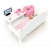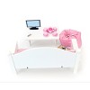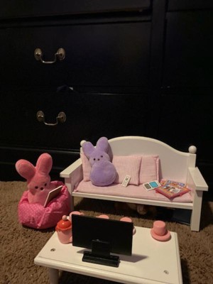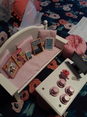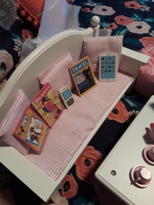 In Eimmie's dream home, the living room is the best place to relax and enjoy friends and company! This couch with pink cushions is a super comfy place for your doll to curl up with a cup of tea and a magazine! Kick up your feet on the pink puff chair, or offer it to a friend who's come over for movie night. This set includes everything a doll needs to sit back, relax and enjoy a quiet afternoon at home. Along with a sofa and coffee table, this set contains a puff chair, couch cushions, a tea set for 4, flat-screen tv with a remote, a tablet, a cellphone, and magazines. Each piece is constructed from sturdy wood with a glossy finish that is built to last for many playtimes.