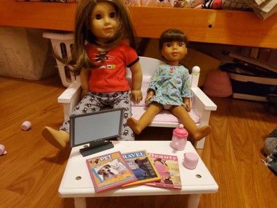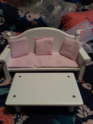 [This review was collected as part of a promotion.] This is super cute! I was really pleased to see a set for 18 inch dolls that is not flimsy plastic. And all the little accessories are such a nice touch! Pros: adorable, easy to assemble, and durable (I think the coffee table could hold my toddler!) Cons: needs some quality control, I had bent screws in my set. Needs some better detail work on the painting, the tea set is kind of ugly in my opinion as are the phone and remote. This is kind of nitpicky though. Overall, super cute, solid set. Great alternative to cheap plastic sets.