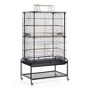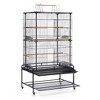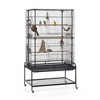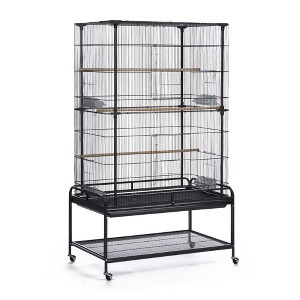 Prevue Pet Products Playtop Flight Cage F085 is a safe and spacious home for multiple small birds. Exceptional engineering makes our flight cage easy to assemble, its lightweight channel construction is heavy duty with rails, clips and alignment tabs to keep cage parts aligned, strong and sturdy. Cage comes complete with playtop, slide out storage shelf, pull out grille and debris tray plus durable, easy rolling casters. You can comfortably access the cage interior through two large front doors, each includes a smaller inset door for more controlled access. Cup doors feature integrated, bird proof door jams to prevent escape. Playtop area can be securely closed when not in use. Built in slide out shelf is perfect for storing extra toys or treats. 4 plastic food/water cups and 4 wood perches are included. Expertly designed in the USA, all Prevue cages undergo independent lab testing to conform to the highest levels of pet safety. Suitable for multiples of small to medium sized birds, our Playtop Flight Cage measures 37" Long, 23" Wide and 63" High with 7/16" wire spacing. Height with open playtop is 69 1/2".