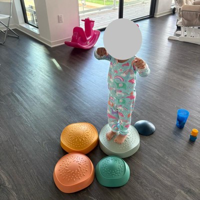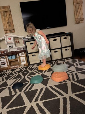 I have been curious about these stepping stones for a while, and I am so glad we tried these out. We only played with them inside so far but I can imagine they would be just as fun outside as well. They can be laid out on the floor to jump across, stack nicely to balance on, etc. They are nice and sturdy so all of my kids can play with them and they seem very durable.