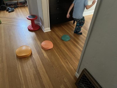 These are such well-designed stepping stones! They have an arched shape and bumpy texture which makes them enjoyable to step on. They have a non-slip coating on the underside so they won't slide or scratch hardwood floors. We're immediately going to buy more because these are so fun and good for our kids balance!