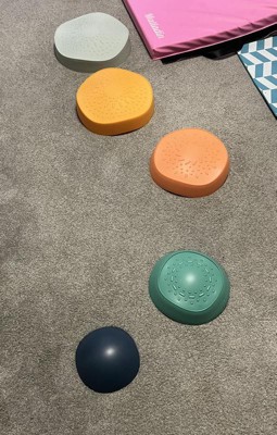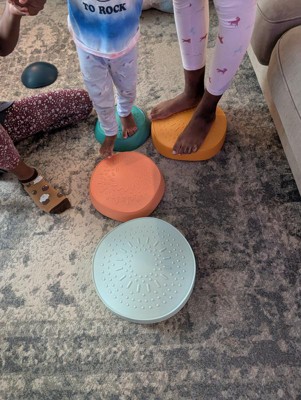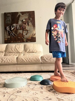 Get Moving! Hop Skip Bounce! Stackable Stepping Stones are perfect for kids practicing balance and coordination. Safe motor skill development while having FUN! This 5 piece set has non-slip rubber bottoms. Stack them up like blocks or inside each other for easy storage. Texture tops for sensory play! Use inside or outside.