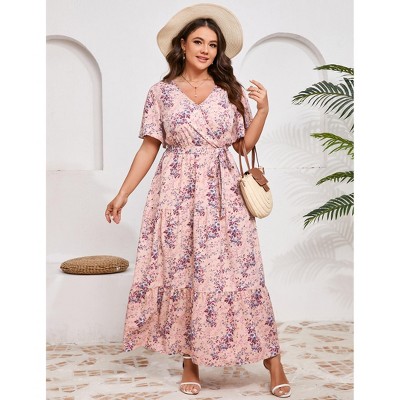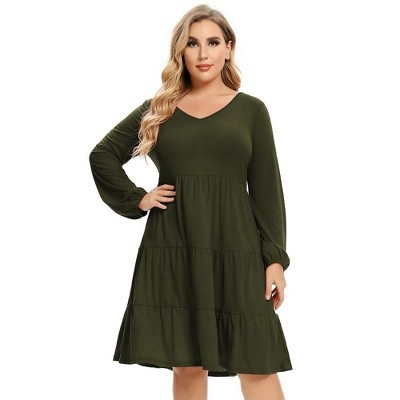 Plus Size Dress Women's V Neck A-Line Knee Length Wrap Mini Dress with Belt Olive-cs 4X-Large