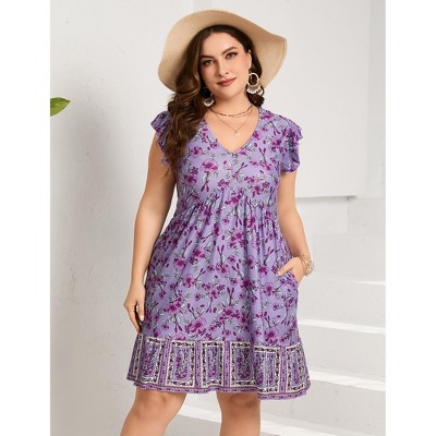 Plus Size Women's V-Neck Midi Dress - Short Sleeve, Wrap Waist with Belt, Flowy Pleated Skirt Purple 3X