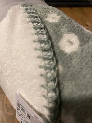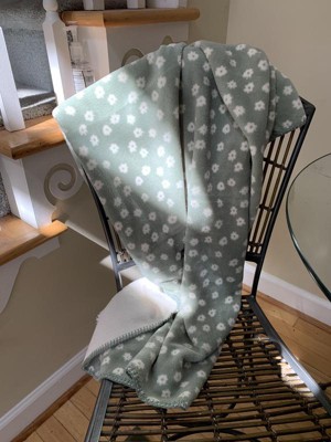 A: The blanket features an allover white floral print on a green backdrop.