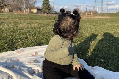 Such a pretty blanket! Soft, cozy, fleece-y. The rainbows are pretty. It’s definitely cream and not white. And the perfect size for covering a car seat or stroller, or a snuggle blanket. Just wish it came in a bigger size too.