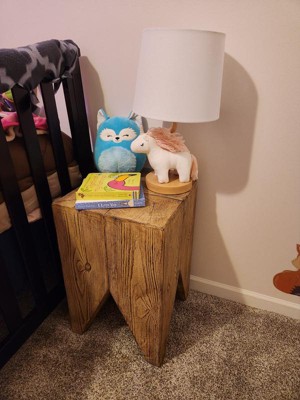 This is the cutest little lamp for your girl’s room! It’s a plush, soft, muslin like stuffed unicorn with pale pink yarn for hair and an iridescent horn. The base looks like a light colored wood, but it feels like metal. Really nice quality and the perfect touch for a bedroom or playroom lamp.