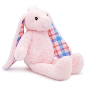 Say hello to the cutest bunny in town! Our 18 inch pink plush bunny is an adorable keepsake to share snuggles and adventures with your little ones. Without plastic parts or choking hazards, theyll feel safe and loved all the time. With textured fur and embroidered details, it provides a full sensory experience and no screens necessary! Let your children celebrate Easter with this ultra soft, plaid patterned-eared bunny for cuddles and screen free playtime all year round!