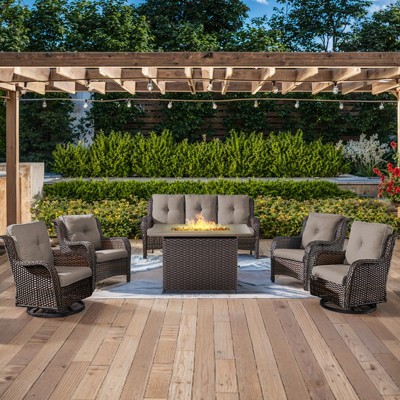 POCASSY 6-Piece Outdoor Furniture Set with 50000BTU Propane Fire Pit, All Weather Wicker Patio Fire Pit Table Set with 3-Seater Sofa and Club Chair