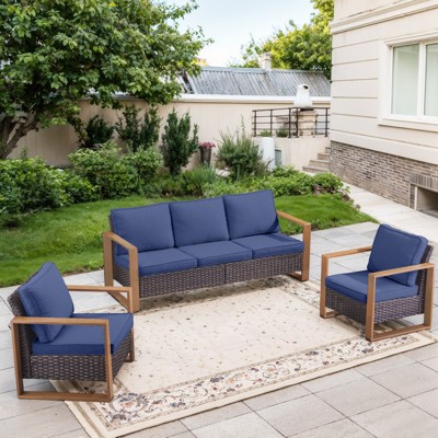 Elevate your outdoor living space with this stylish and practical wicker furniture set. Featuring a spacious 3-seater sofa and two patio chairs, each piece is designed with modern square-shaped faux wood metal armrests for a sleek, contemporary look. The cushions offer superior comfort, with back cushions made of 100% polyester fiber and seat cushions crafted from a blend of 87% polyurethane foam and 13% polyester fiber batting!aall wrapped in durable, weather-resistant Olefin fabric. The handwoven PE wicker adds a refined touch, while the sturdy square legs ensure lasting stability and support.