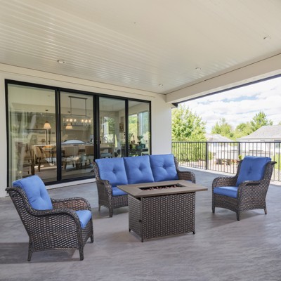 POCASSY Patio Furniture Set with 30" Propane Fire Pit Table, Patio Swivel Rocking Glider Chairs Set of 4 with PE Wicker and Square Firepit Table