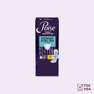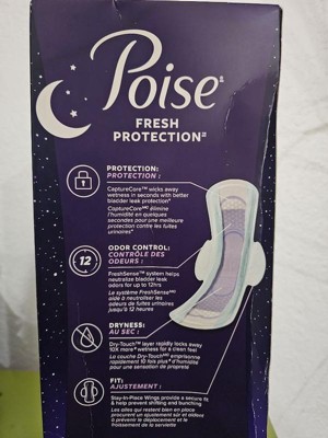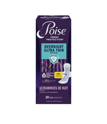 Enjoy up to 100% clean, dry and fresh protection guaranteed* with Poise Overnight Incontinence & Postpartum Pads with Wings for Bladder Leaks. Unlike period pads, which are meant for menstrual needs, Poise pads are designed to offer protection against light bladder leaks. Offering up to 12 hours of wetness protection, our incontinence pads for women are 25x drier than the leading period pad to help you get a good night’s rest. They also feature a CaptureCore that wicks away wetness in seconds for better bladder leak protection than the leading period pad​. The Dry-Touch layer rapidly locks away more wetness than the leading period pad for a clean feel. Poise Ultra Thin Incontinence & Postpartum Pads for bladder leaks are available in 3 Drop Light, 4 Drop Moderate, 5 Drop Maximum, 6 Drop Ultimate, and 8 Drop Overnight absorbencies. Shop for Poise discreetly by having it shipped directly to your door or pick up curbside. Poise adult incontinence products are HSA/FSA-eligible in the US — check with your provider for coverage details. (*Purchase by 12/31/25. All requests must be postmarked within 30 days of purchase. Online access required. Limit 1 per household. Original receipt/UPC required. Restrictions apply. See Poise website for details)​