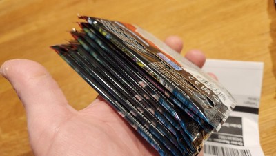 When I opened the package the packs were already taken out of their paper holders and the packs were messed with because when I opened the packs them selves alot of the cards were upside down.