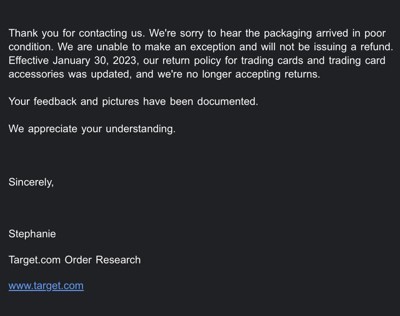 Target ships with 0 protective padding and all my products arrived mangled and damaged. Support offered 0 remorse or willingness to help the situation. Will never order cards from target again.