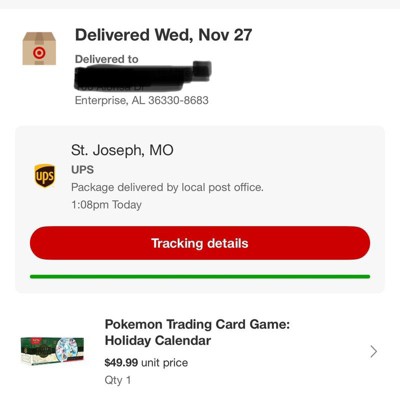 Somehow Target sent my order to Alabama and it was suppose to come to North Carolina. Apparently this is a high risk item and this has happened before. The best they can do is submit a ticket that will take 5-7 business days to resolve. It is an advent calendar, 1/2 the month will be over by then! Will never order anything with trading cards from Target again as this diversion seems to be a known problem on their end.