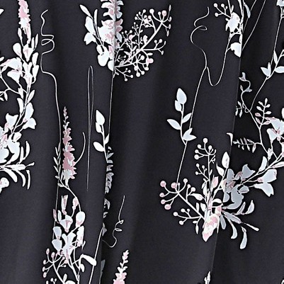 Beautiful lace yoke and chiffon trim collar accent this high neck gaiter dress. Dress features contrasting white floral print on black that is sure to be a conversation starter. Additional features include button closure at the back neckline and cinched waist.