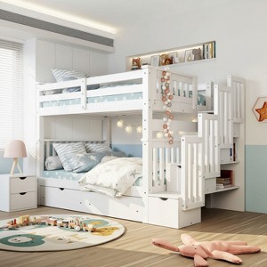 - [4-Tier Staircase with Built-In Storage] Forget wobbly ladders—the solid staircase offers secure, easy access to the top bunk and doubles as functional storage. Each step includes a pull-out drawer, plus there are built-in open shelves at the side, perfect for books, toys, or bedtime essentials.