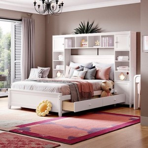 Maximize bedroom efficiency with the Polibi Full Size Wooden Bed, an all-in-one sleep and storage solution designed to streamline your space with elegance and utility. Crafted from solid pine wood and premium-grade MDF, this intelligently engineered bed set includes a full-size platform frame, a 14-compartment storage headboard system with 4 enclosed cabinets, and 4 spacious drawers beneath the bed for added organization.