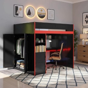 Polibi Gaming Loft Bed with Desk, Storage, LED Lighting and Wardrobe