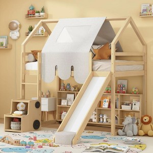 Polibi Loft Playhouse Bed with Slide, Tent Canopy & Built-in Storage