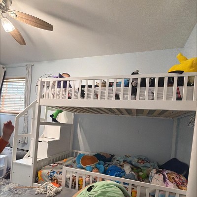 Polibi Twin Over Twin Low Bunk Bed with Fence-Style Rails and Built-In Storage Staircase, Natural