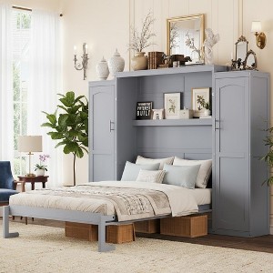 Transform any room into a multifunctional living space with the Polibi Wall-Mount Murphy Bed System, a brilliantly designed all-in-one storage and sleeping solution. This smartly engineered bed folds seamlessly into a sleek wall unit, making it ideal for guest rooms, home offices, or studio apartments. Flanked by two tall wardrobes and integrated with a hidden display shelf that reveals itself when the bed is down, this space-saving masterpiece delivers both style and function. Made from durable pine wood and available in three modern finishes—White, Walnut, and Gray—this Murphy bed system offers full-scale organization and restful comfort in either Full or Queen size.