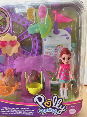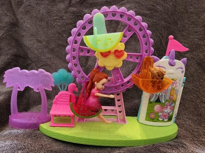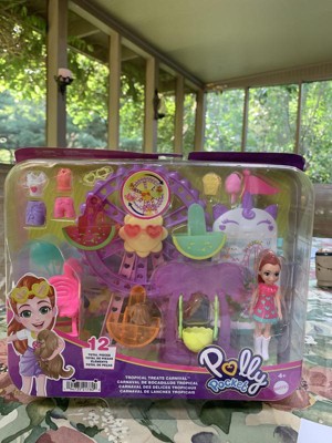 [This review was collected as part of a promotion.] The tropical treats carnival play-set has a portable design that makes it easy for children to move and play with. Its colorful design on the carousel shows the vibrant world of Polly pocket. Upon opening, I discovered a carnival themed scene with Polly pocket herself and several accessories such as a swing, flamingo chair, and cotton candy for Polly to hold. The play-set has interactive features, including moving the carousel around and swinging Polly in the swinging chair. The tropical treats carousel is impressively detailed. The swinging chair details adds to the realism, and Polly pockets attire and accessories are meticulously crafted. The attention to detail from the carousel to the small snacks such as the popcorn enrich the play experience. This play-set encourages imaginative play and storytelling. Children can create their own tropical carnival adventures for Polly. The materials are sturdy enough to withstand frequent play and handling. The play-set is light enough to pack up and carry along for trips or play dates. In conclusion, the Polly tropical treats carnival play-set is a wonderful miniature world that promises hours of imaginative play. With its detailed accessories and engaging features it’s a great choice for creating creativity and adventure for children.