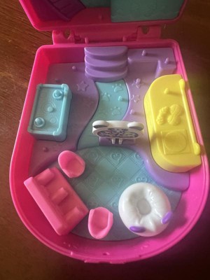 [This review was collected as part of a promotion.] The Polly Pocket Bubble Tea Panda Compact is a cute concept. The colors are bright and the confetti in the front of the play set adds an extra touch of fun. The set contains a variety of pieces including a male figure. This change was nice as it made so that siblings of opposing genders could play together and brothers could now have a figure of their own. Another fun accessory piece was the laptop. The opening and closing feature made it look realistic for the Polly figures. As I am completing this review it has come to my attention that the laptop is now missing which is disappointing as it was a favorite. This play set had many confusing parts. The first piece was the pink couch and where it was supposed to go in the “tea lounge”. The tiny pegs, that are supposed to go into the plethora of pieces, are scattered throughout. There was only one attached chair that spun around. An option that should be considered is to cut down on the number of loose pieces and make them like the spinning chair. The air hockey table does not function in any way and seems like it is taking up space that could be used for something interactive. The lack of moving and interactive pieces makes this play set less fun than other Polly Pockets that I have seen in the past. The staircase could have been better constructed and made so that the figures could walk up and down them instead of merely looking like a purple curved ladder. Despite the various areas that have been less favored in this set, it does have a lot of potential. The blue “Straw” could be turned into a button that makes the sequin bubbles on the front of the Polly Pocket move. The plastic strap could be replaced with a handle to make it easier to carry. A final recommendation for enhancement would be to give the play set a latch that turns and keeps the set securely closed.