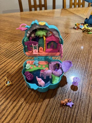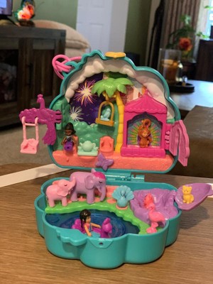 [This review was collected as part of a promotion.] This is my eight year old's first Polly Pocket and it went over so well! It's very cute and has so many little figures she can move around. The peacock on the case has a turnable tail, it has a pool where the elephants can play, and came with two dolls so she and her friend could play pretend. It has a little break-away tether on the outside that my daughter has been hanging from her purse she carries around and the latch is strong enough that it hasn't opened accidentally. It's a hit and I suppose there will be more Polly Pockets in our future.