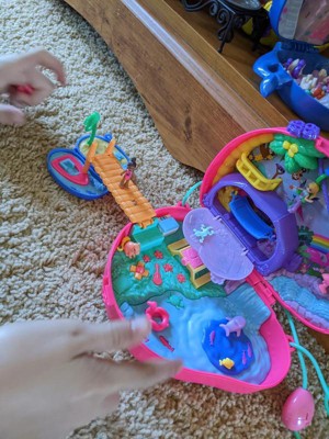 [This review was collected as part of a promotion.] The sloth poly pocket set is a lot of fun. It has a Zipline, picnic area, bridge and area for the girls to swim. There is a secret nook with a hammock and many cute animals. My daughter loves all the animals and details like the flipping picnic table top so the girls can eat a meal. The baby sloth beach with a boat is also very fun.