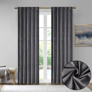 - Room darkening solid velvet, with metallic detail rod pocket/back tab window curtain pair in 3 sizes