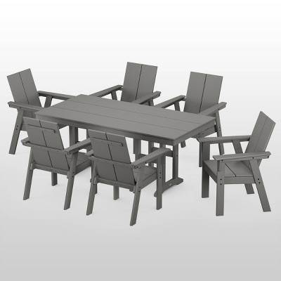 The Prairie 9-Piece Square Farmhouse Dining Set with Trestle Legs updates traditional design in a bold new way. Clean lines, square angles, and single-slat backs refresh the Craftsman-inspired seating for a style that lasts through the seasons. Paired with an all-weather trestle base dining table, it all comes together as the total package for alfresco entertaining. Bonus: Everything resists spills and stains for easy cleaning.