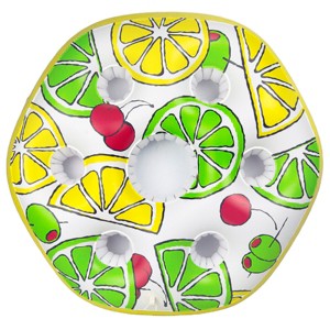 Enjoy your drinks poolside with this inflatable floating drink holder featuring a fun lemon and lime design. The sturdy center tray is surrounded by six beverage holders, keeping your drinks close and secure. Perfect for lounging in the water, it proudly reads "Refreshment Float" and is constructed from durable 10-gauge vinyl for long-lasting use. Ideal for pool parties, beach days, and more!